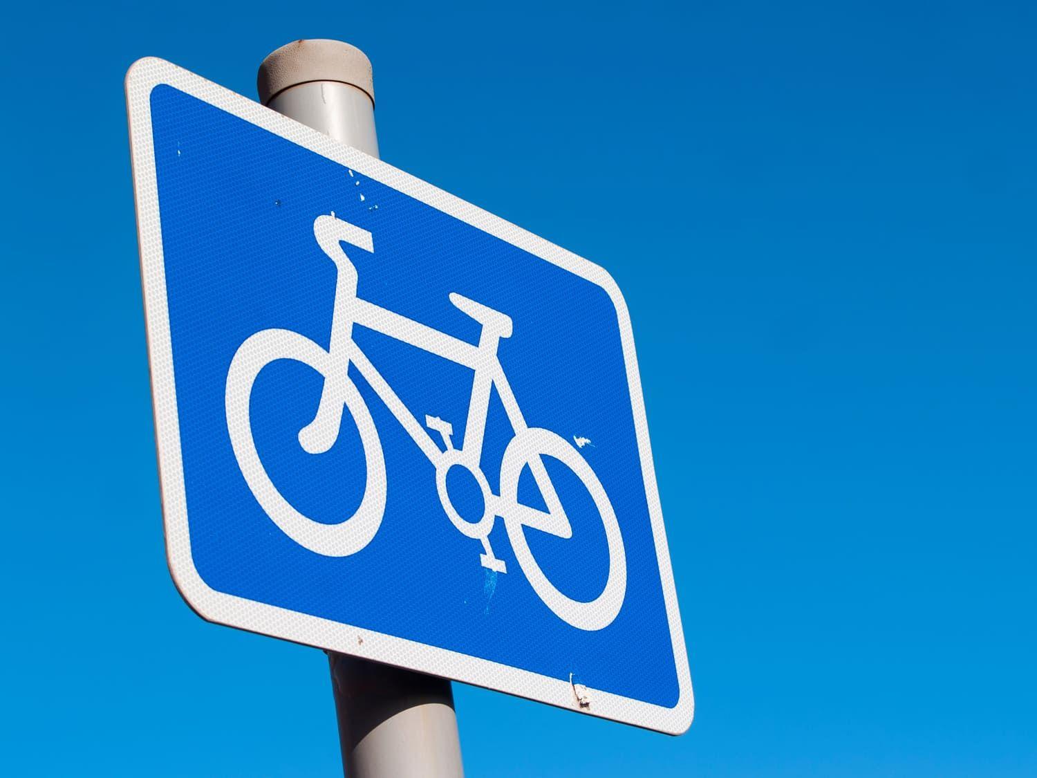 This white bike on a blue background simply means a recommended route for pedal cycles on a road.
