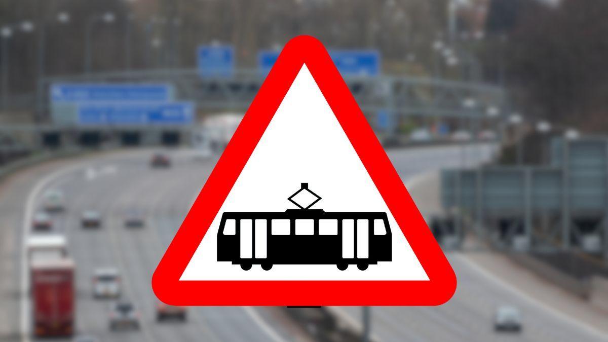 triangulo con borde rojo y tranvía en el centro