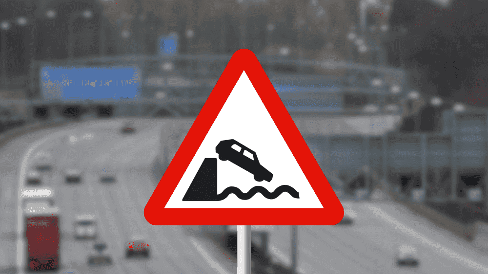 Triángulo con borde rojo y un coche en dirección al agua